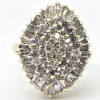 14ct yellow gold dress ring, narrow, flat, reverse tapered shank with open back, multi-claw setting, polished finish.